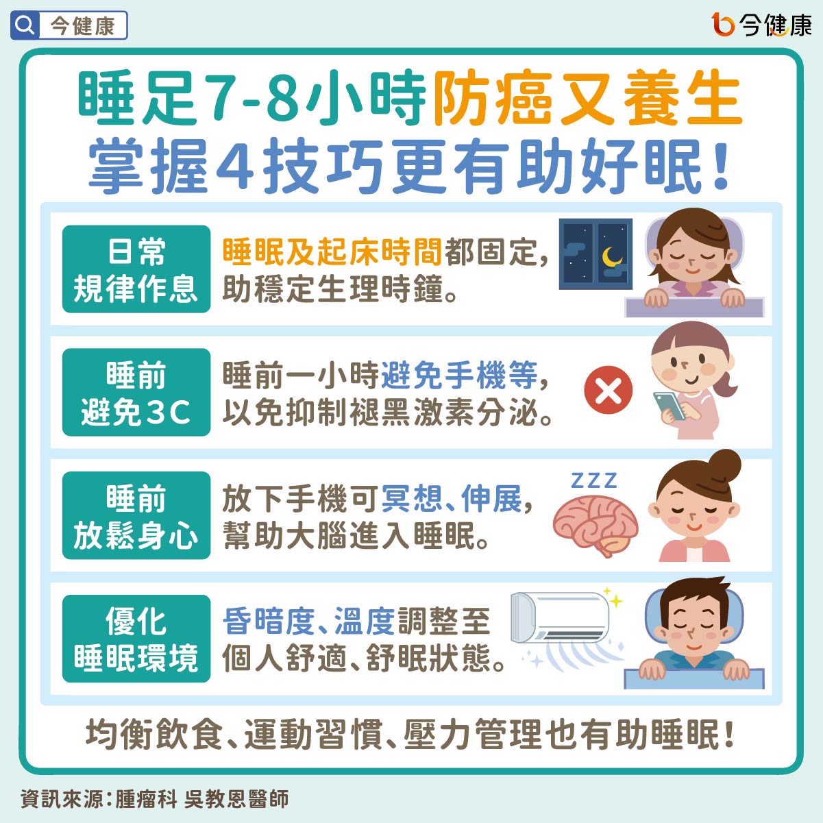 大家都知道睡飽、睡好有助養生。不過你知道嗎?睡得「剛剛好」還有助防癌!反之,不少研究發現,睡太少、睡太多都可能增加癌症風險。究竟要怎麼睡才好?腫瘤科吳教恩醫師在社群分享,教大家怎麼睡最健康!