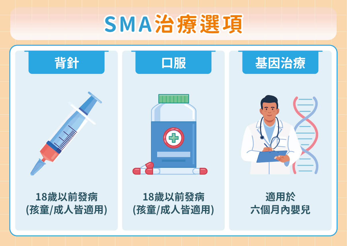 目前國際間最受矚目的三種SMA治療方式,已全數納入台灣健保給付,讓病友不再因高額費用而卻步。目前台灣健保已給付三種SMA治療方式。其中背針治療(反義寡核苷酸藥物)與口服藥物(小分子藥物)都屬於「基因剪接調節藥物」:前者需透過脊椎注射定期施打,後者則是每日定時口服,兩者皆需長期使用。另一種則是基因治療,利用類腺病毒載體,將缺失的SMN1基因送入體內,一次性靜脈注射即可完成,終生僅能施打一次。