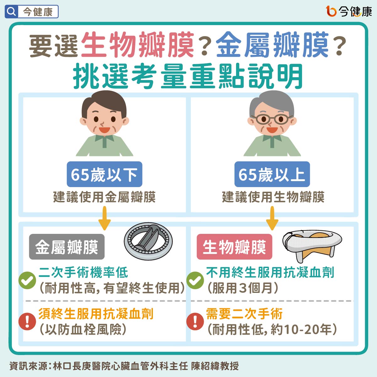 生物瓣膜通常為牛或豬組織,抗凝血劑僅需服用約3個月,較不影響生活,因此建議65歲以上的患者。不過生物組織終究會損壞,年限約10-20年,就需要「二次置換」。