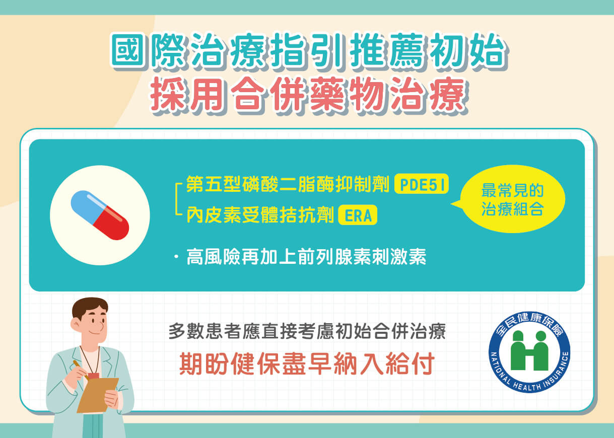 過去肺動脈高壓缺乏治療手段,但近年已有超過10種藥物、4大機轉可用。研究證實,若在確診初期就採用合併療法,疾病惡化的機率可比單一藥物降低一半。若患者一開始即為高風險,醫師可能直接加入第三種,以更快穩定病情。但陳昱瑋醫師也提到,目前健保規範通常要求「先用一種、效果不佳才能加第二種」,與國外起始即雙藥並用的標準仍有落差。這也是現在正在持續努力的方向,希望未來更多病患能更早受惠。