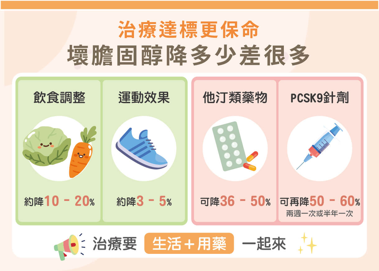 很多人認為只要透過飲食改善或規律運動就能有效降低膽固醇並遠離心血管疾病,然而臨床研究顯示,在中高風險族群中僅靠改變生活習慣往往無法達到足以改變疾病走向的目標。雖然飲食控制與運動對整體健康有益,但對於已處於高風險或具有明顯斑塊者,這些方法的降膽固醇幅度有限,可能不足以阻止斑塊繼續累積。