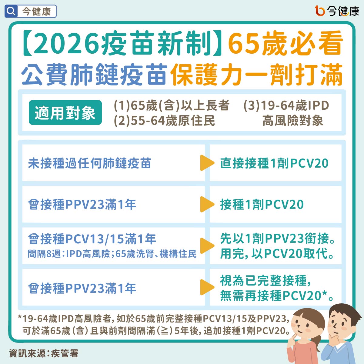 針對肺鏈疫苗,政府近年也持續擴大公費接種對象,並宣布自2026年1月15日起,公費疫苗升級為新型20價疫苗(PCV20),只需接種1劑即可完成保護!若過去曾接種過其他肺鏈疫苗,只需依規定隔一年後在接種新型疫苗即可,同樣能獲得完整保護。
