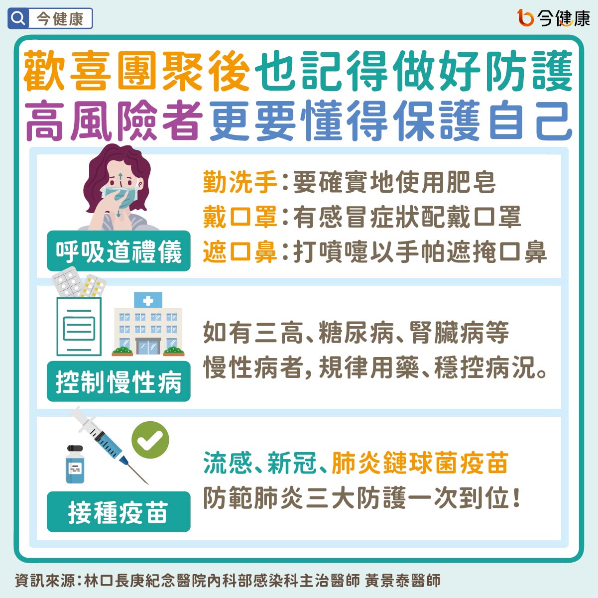 黃景泰醫師提醒,40歲以上、尤其65歲以上及慢性病族群,在年前、年後更要懂得保護自己,遵守呼吸道禮儀,包含確實的使用肥皂勤洗手、有感冒症狀配戴口罩、打噴嚏以手帕遮掩口鼻;有慢性疾病者遵照醫囑用藥、穩定病情,以維持身體保護力。更重要的是,透過醫學實證的方式,扎扎實實的做好預防措施:接種疫苗。
