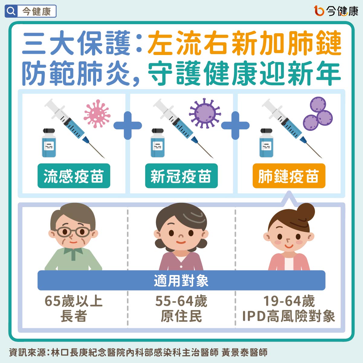 流感、新冠、肺炎鏈球菌都是國人導致肺炎的主因,即便已接種流感、新冠疫苗,若少了肺鏈疫苗,仍可能引發肺炎重症。黃景泰醫師建議,在接種流感及新冠疫苗的同時,可再加上肺炎鏈球菌疫苗,形成「左流右新加肺鏈」三重防護,建立全方位的健康防護網,有效降低重症、死亡風險。