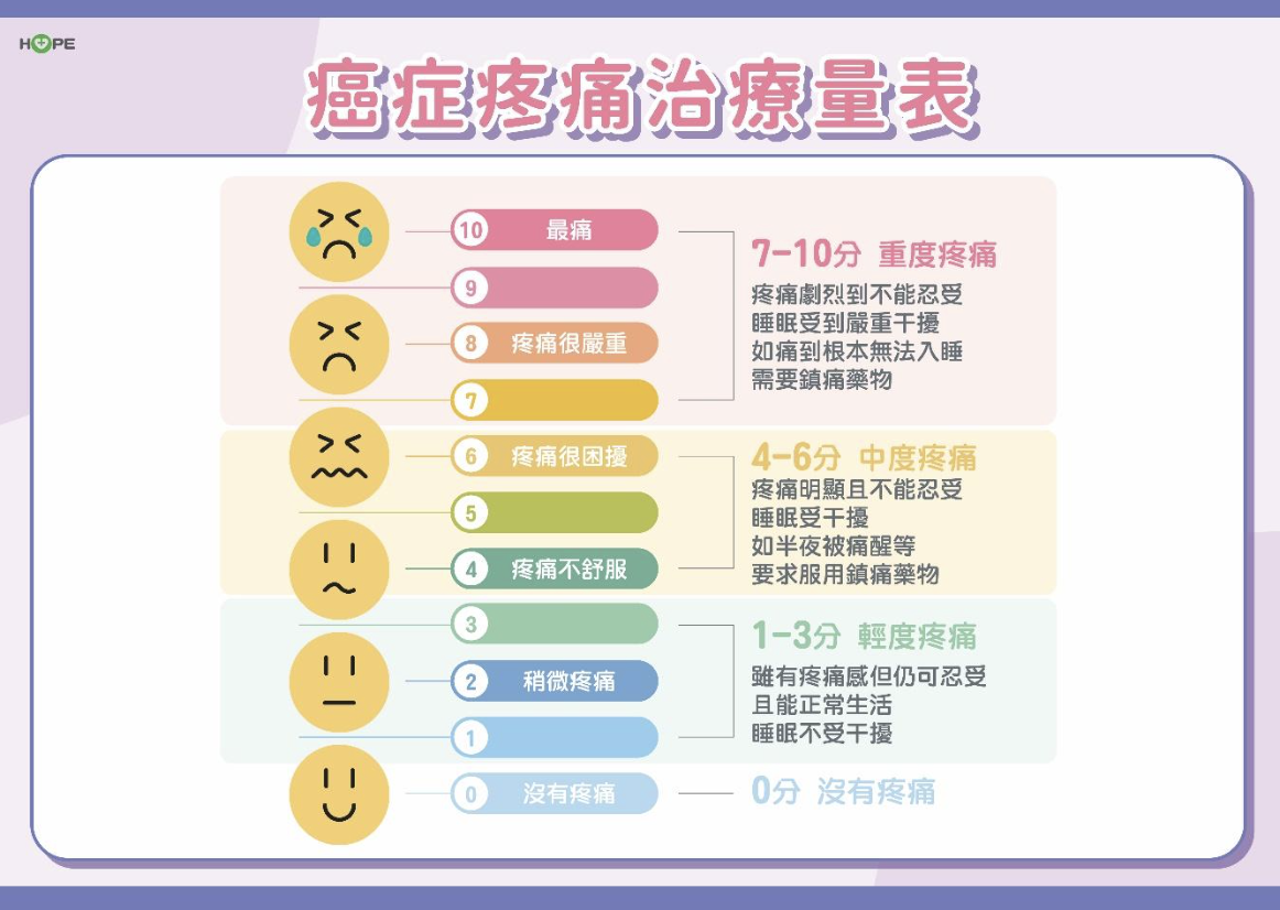 賴允亮指出,癌症疼痛的藥物可分為非鴉片類止痛藥與鴉片類止痛藥兩種。一般而言,1-3分的輕度疼痛可以吃普拿疼等的非鴉片類止痛藥,4-6分的中度疼痛可以使用弱效性鴉片藥物,7分以上重度疼痛要使用強效性鴉片藥物。