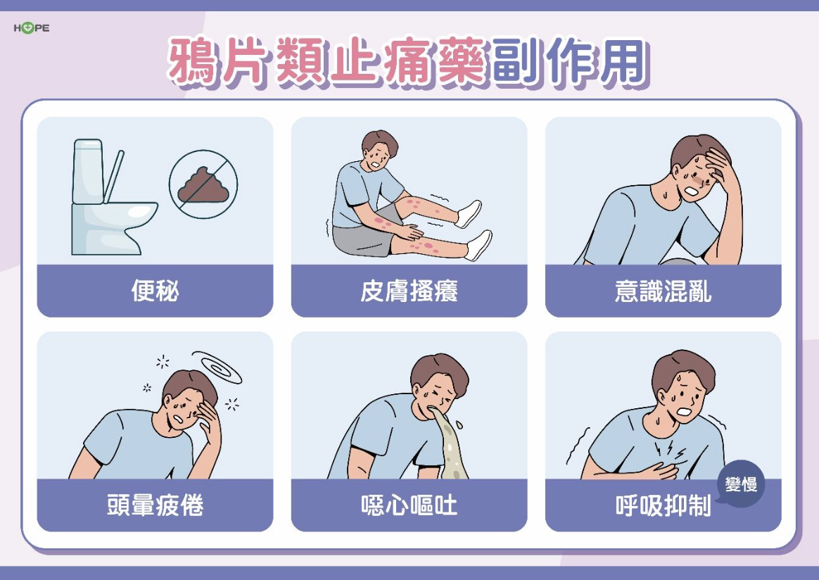 很多病人擔心鴉片類止痛藥會成癮,不敢用藥,但其實鴉片類止痛藥的成癮性非常低,不須擔心。只是,但凡是藥物就會有副作用,鴉片類止痛藥也有相應的副作用,諸如:皮膚搔癢、意識混亂、頭暈疲倦 、噁心嘔吐、呼吸抑制等,但這些副作用皆會隨時間而緩解、或正確使用而消退,唯獨「便秘」是最棘手的副作用!