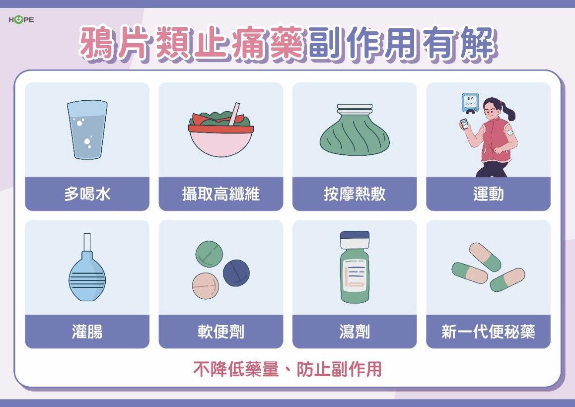 鴉片類藥物在止痛時,同時會抑制腸道蠕動,導致排便困難,甚至形成「糞石」。建議病人用藥時可以多喝水、攝取高纖維蔬菜、運動、熱敷等方法,以及使用瀉劑、軟便劑、灌腸劑等藥物來改善。但針對嚴重的便秘,目前也已有新一代藥物,能對症下藥、有效阻斷鴉片類止痛藥對腸道神經的影響。