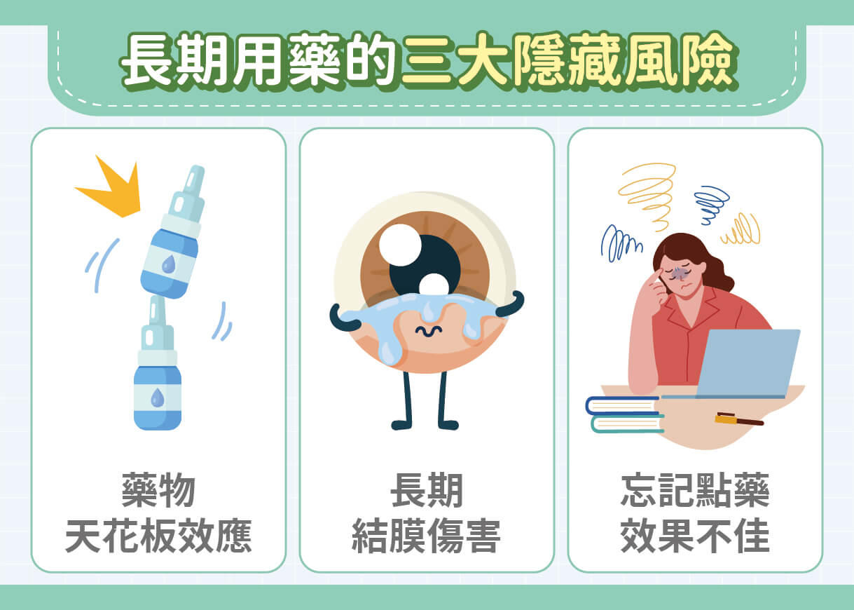 「目前唯一被證實能夠延緩青光眼進展的方法,就是降低眼壓。」呂威揚醫師表示,大多數患者初期可透過眼藥水控制眼壓,但隨著病程拉長,往往需要從一種藥水增加到兩種、甚至三種。然而,藥水數量越多,問題也隨之而來。多數青光眼眼藥水都含有防腐劑,長期使用可能導致角膜反覆受損、結膜慢性發炎,造成眼睛紅腫不適,也讓患者愈來愈排斥點藥。